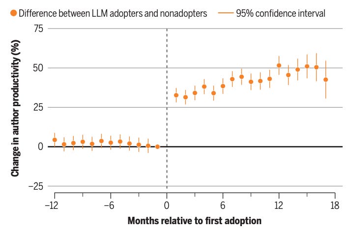 The second school of thought is that AI tooling will indeed help better researchers publish more and take on a more managerial role in conducting science. More higher-quality research will proliferate and we’ll all be better off for it. The recent article in Science from researchers at Cornell and Berkeley, “Scientific production in the era of large language models,” did not get nearly enough attention. They found that authors who started using LLM tools became measurably and substantially more productive.